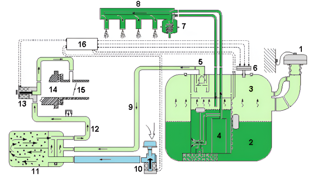 - vaporii de benzină (3) trec prin separatorul lichid-vapori (5), parcurg conducta de ventilare (9) și ajung în canistra de carbon (11), unde sunt stocați