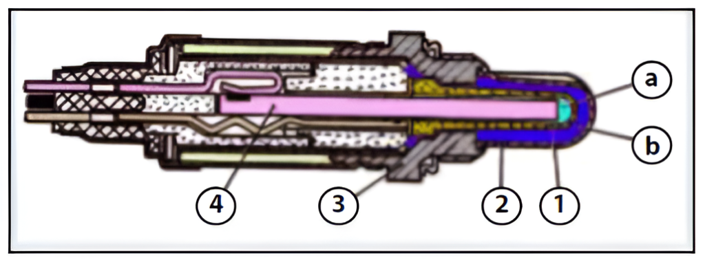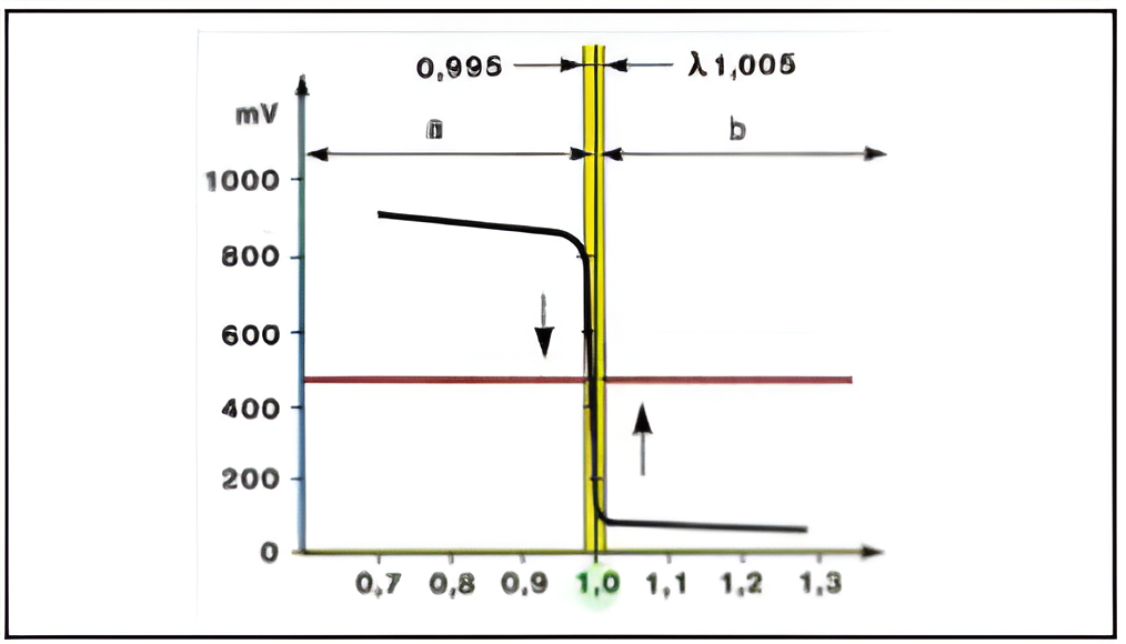 Se poate observa că semnalul provenit de la senzor, variază abrupt la modificarea factorului λ de la valoarea 1 (banda îngustă). Senzorul are în alcătuirea sa, o rezistenţă de încălzire alimentată din ECU, care previne şocurile termice care ar putea apărea la contactul traductorului cu apă condensată din gazele de eşapament. Construcţia lamelară a traductorului permite încălzirea rapidă, la doar 10 secunde după pornirea motorului, reducând astfel timpul în care motorul funcţionează fără monitorizarea emisiilor de către centrală de comandă.