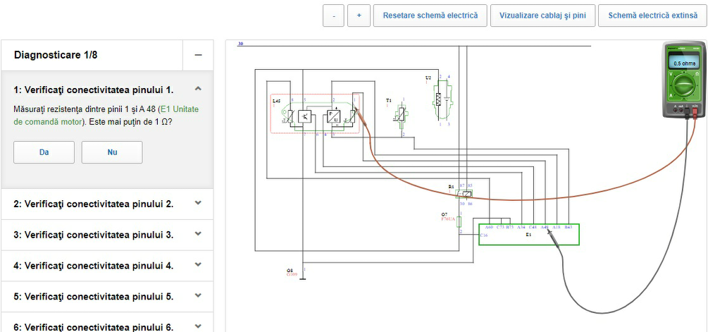 La acest pas, ești rugat să iei un multimetru și măsori rezistenţa dintre pinii 1 şi A 48 (E1 Unitate de comandă motor). Apoi te întreabă daca aceasta este mai mică de 1 Ω?