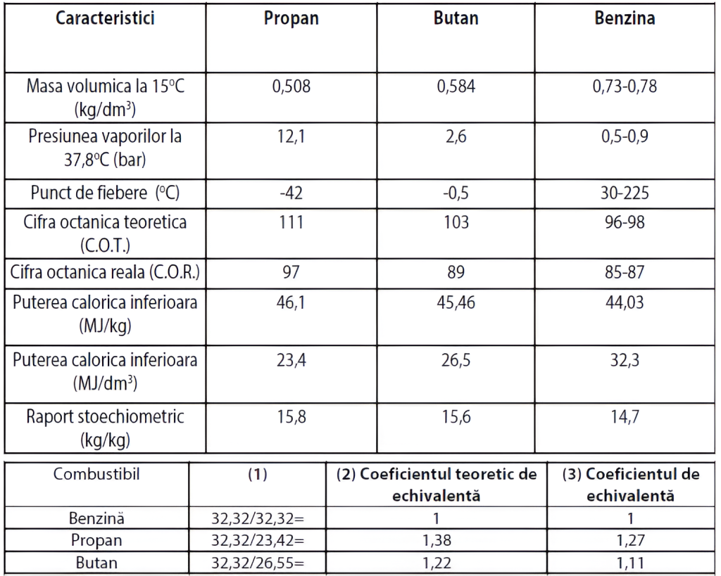Cifra octanică teoretică (C.O.T.) şi cifra octanică reală (C.O.R.) arată că butanul şi propanul au o caracteristică antidetonantă care este superior mai mare decât cea a benzinei.Masa calorică creşte de la benzină la propan iar volumul caloric scade. În ceea ce priveşte alimentarea motoarelor cu GPL, testele au dovedit că, atunci când sunt comparate cu cele alimentate cu benzină, acesta are o eficienţă mai ridicată cu aproape 8% ceea ce reduce coeficienţii de echivalenţă ai butanului şi propanului, la valorile teoretice de 8%.