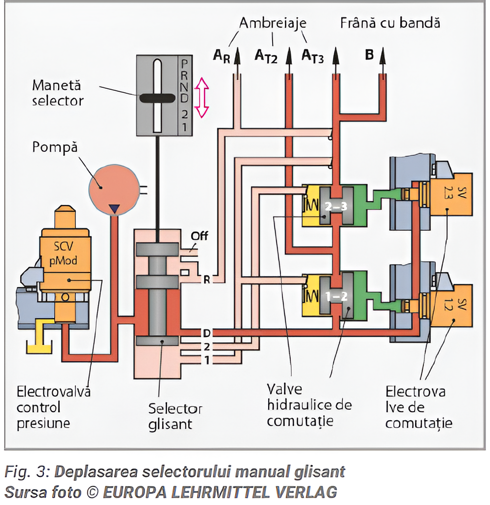 Aceste stări sunt procesate de unitatea electronică de comandă a cutiei. Supape cu solenoizi sunt acționate electric în funcție de regimul în care se află autovehiculul. Aceste supape acționează la rândul lor supape hidraulice care modulează presiunea din diversele elemente acționate hidraulic. Schimbarea treptelor în cadrul cutiilor se realizează în funcție de accelerări și decelerări. (Fig.1).