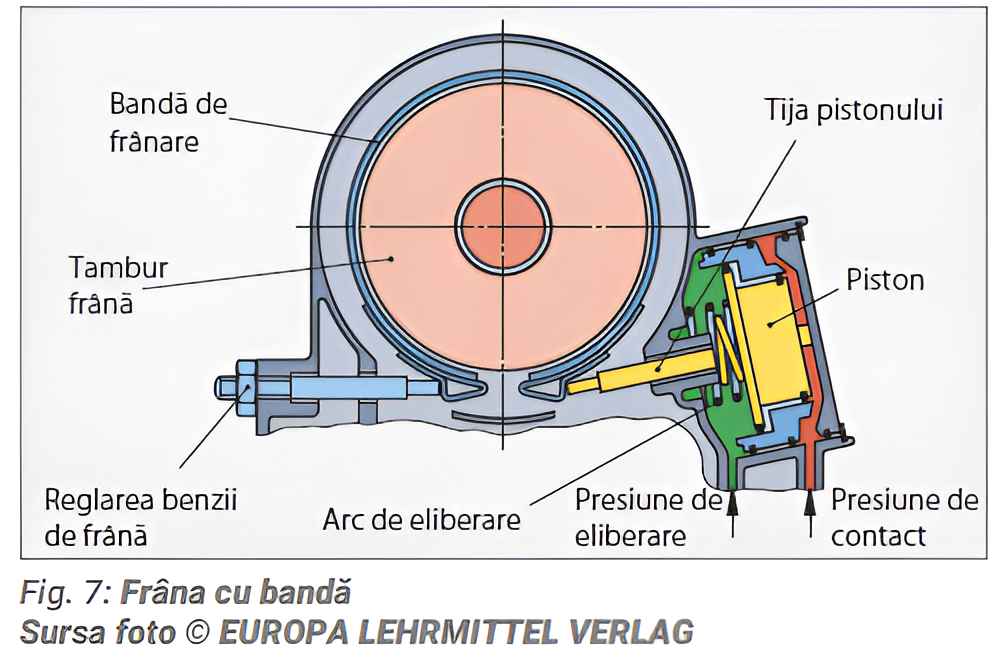 Atunci când uleiul hidraulic sub presiune acționează asupra pistonului, tija realizează o mișcare de translație, lipind banda de suprafața tamburului.