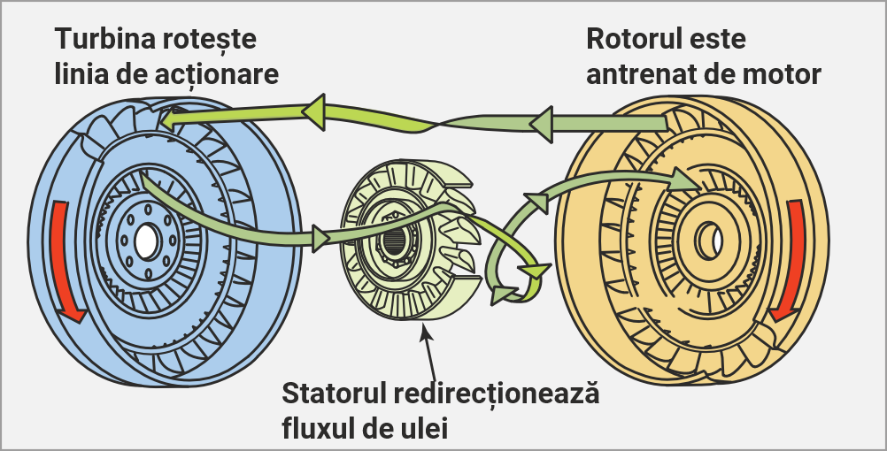- Fluxul rotativ este creat de rotația convertizorului de cuplu și face ca uleiul (ATF) să curgă în jurul circumferinței convertizorului de cuplu.