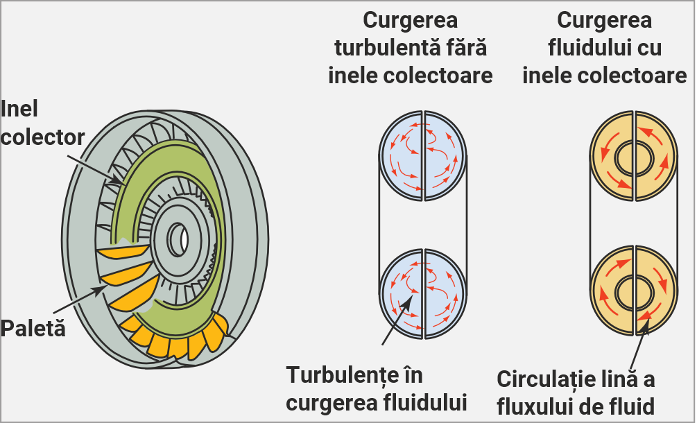 Legătura numai cu fluid între rotor și turbină permite absorbția șocurilor bruște și dure în ceea ce privește viteza și/sau cuplul. Curba paletelor statorului este opusă curbei paletelor rotorului și turbinei.