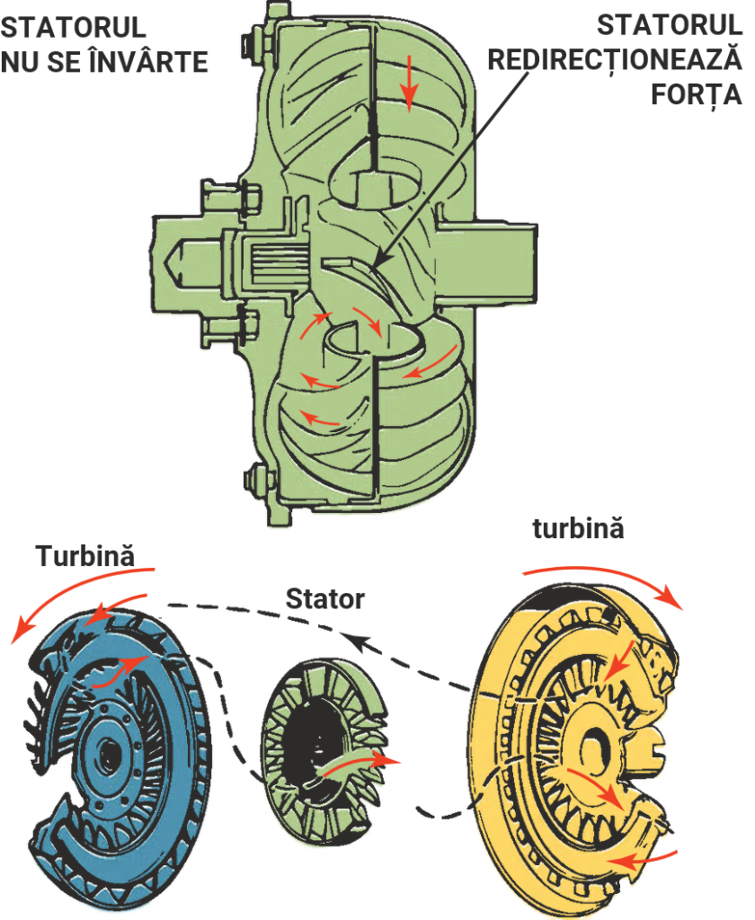Deoarece statorul este situat între rotor și turbină, acesta schimbă direcția fluidului la ieșirea din turbină și, astfel, multiplică cuplul de la rotor.