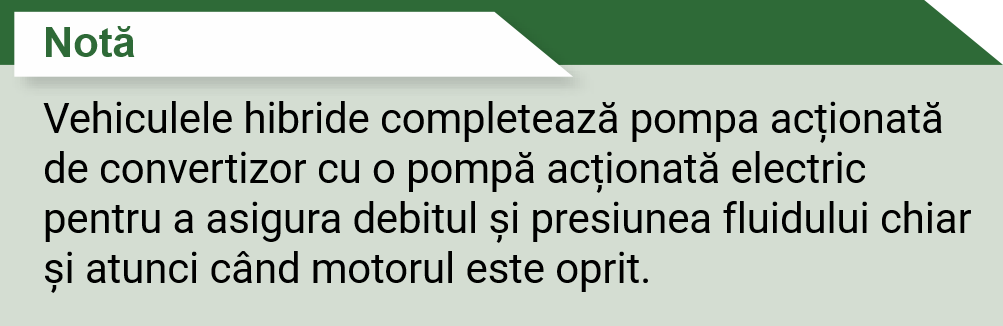 Arborele de acționare a pompei de ulei trece în general prin convertizor în interiorul unui arbore de intrare sau de transfer gol și se conectează în interior la carcasa convertizorului prin intermediul unor caneluri sau al unui arbore de formă hexagonală. Convertizorul de cuplu este, de asemenea, responsabil pentru acționarea pompei de ulei a transmisiei, numită uneori pompa din față, deoarece unele transmisii de la începutul anilor 1950 foloseau o pompă din spate atașată la arborele de ieșire pentru a permite "pornirea prin împingere" a vehiculelor echipate cu transmisie automată. Porțiunea interioară a pompei frontale se cuplează la butucul convertizorului de cuplu folosind fie "platouri", fie " pene". Butucul de acționare a convertizorului din partea din spate a carcasei convertizorului de cuplu trece peste suportul statorului și prin garnitura de ulei din față pentru a se cupla cu pompa de ulei și a o acționa. Deoarece carcasa convertizorului de cuplu este înșurubată și se rotește odată cu motorul, acest lucru asigură faptul că pompa de fluid se va roti numai atunci când motorul se rotește.