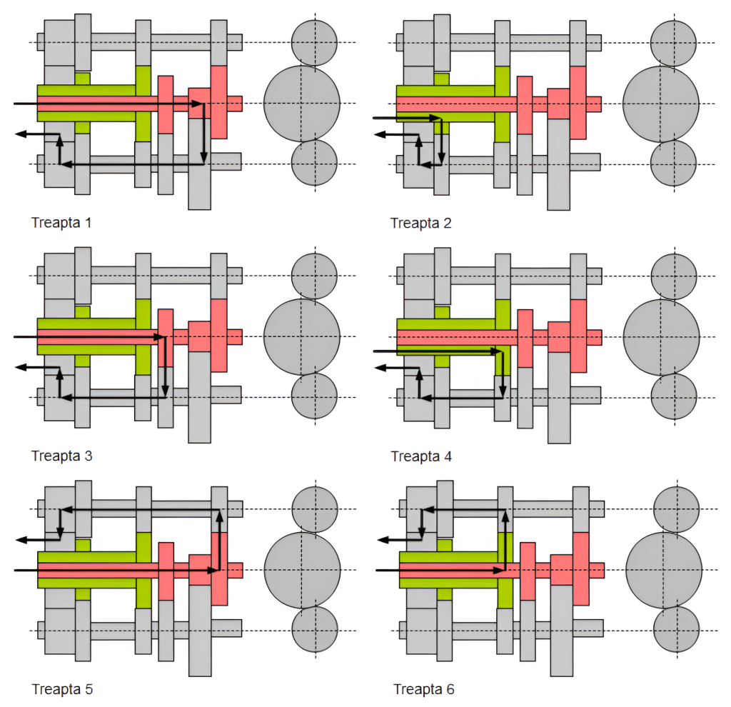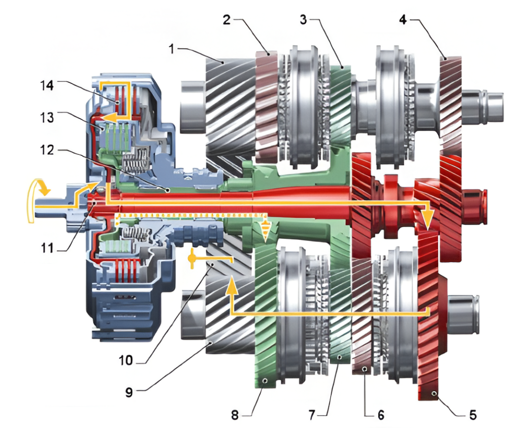 De exemplu, pentru a transmite cuplul motor în treapta 1, ambreiajul 1 (14) este cuplat și arborele de intrare 1 (11) este antrenat. Treapta 1 se realizează prin angrenajul (5) situat pe unul din cei doi arbori de ieșire. Fiecare arbore de ieșire angrenează cu coroana diferențialului (10) prin intermediul unor angrenaje (1 și 9). Cu treapta 1 cuplată se poate preselecta treapta a doua iar în momentul schimbării efective a treptei de viteză ambreiajul 1 se decuplează și ambreiajul 2 se cuplează preluând cuplul motor.