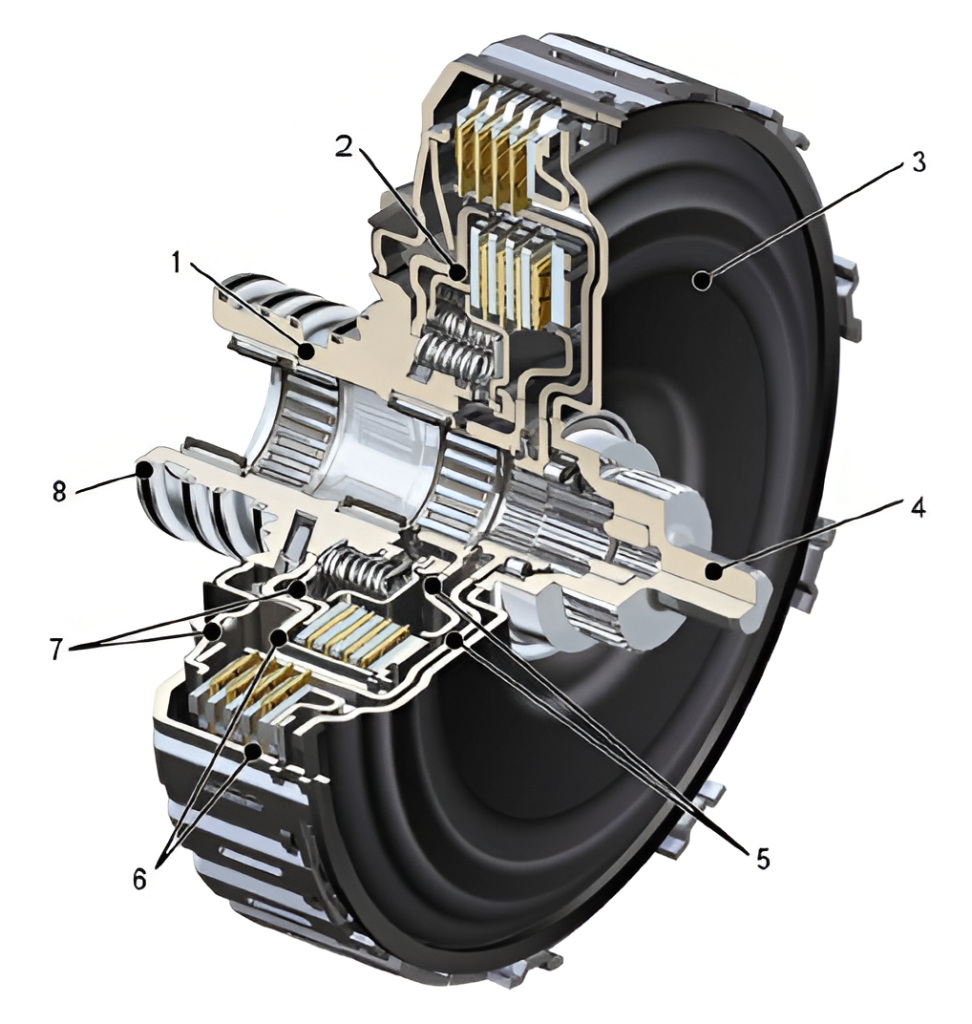 Pe butucul arborelui de intrare (4) este montată volanta cu masă dublă (DMF) care transmite mișcarea de la arborele cotit al motorului. Mai departe mișcarea se transmite prin intermediul carcasei (3) la discurile de intrare (6) legate rigid de aceasta și de butucul principal (1). Pistoanele de cuplare a ambreiajelor (7), controlate în presiune de calculatorul DSG, comprimă discurile acestora și transmit mișcare discurilor de antrenare a arborilor cutiei de viteze (5).