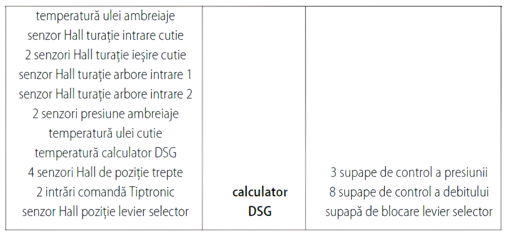 Modulul mecatronic conține calculatorul DSG, senzorii de poziție, turație, presiune și temperatură, precum și toate supapele electromagnetice. Acesta este compact și integrat în carcasa cutiei de viteze. Modulul mecatronic controlează cuplarea și decuplarea ambreiajelor și a treptelor de viteză. De asemenea controlează și circuitul de răcire al uleiului de transmisie. Calculatorul DSG primește informații de la senzori și pe baza acestora decide treapta de viteză necesară. Informația de turație intrare cutie este citită de pe carcasa ambreiajelor cu ajutorul unui senzor Hall. Această turație este de fapt turația motorului termic. Calculatorul DSG utilizează turația de intrare în cutie pentru a calcula patinarea ambreiajelor. În cazul în care senzorul de turație intrare cutie este defect, această informație se înlocuiește cu turația motorului primită de pe magistrala CAN.