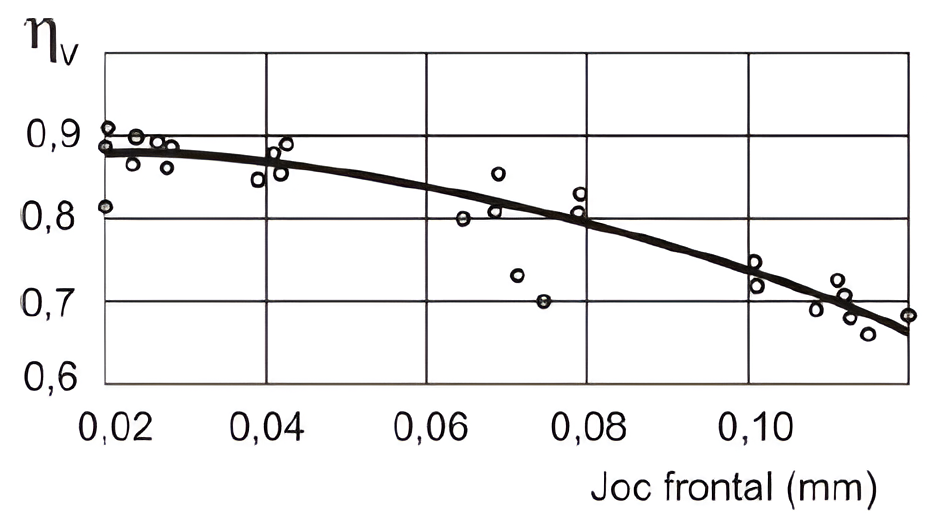 Micşorarea presiunii uleiului în rampă centrală este cauzată de mărirea jocurilor în lagărele arborelui motor, în lagărele arborelui cu came precum şi de uzură pompei de ulei. Presiunea uleiului din rampa centrală poate fi un indicator al gradului de uzură a lagărelor arborilor motor şi cu came. Reducerea globală a presiunii în rampă centrală de ungere faţă de presiunea iniţială are loc, în funcţie de parcurs (ore de funcţionare a motorului). Reducerea globală a presiunii este cu precădere rezultatul uzurii pompei de ulei, la care se micşorează randamentul volumetric odată cu creşterea jocului frontal între pinioane şi carcasă, fenomen reprezentat grafic în figura următoare.