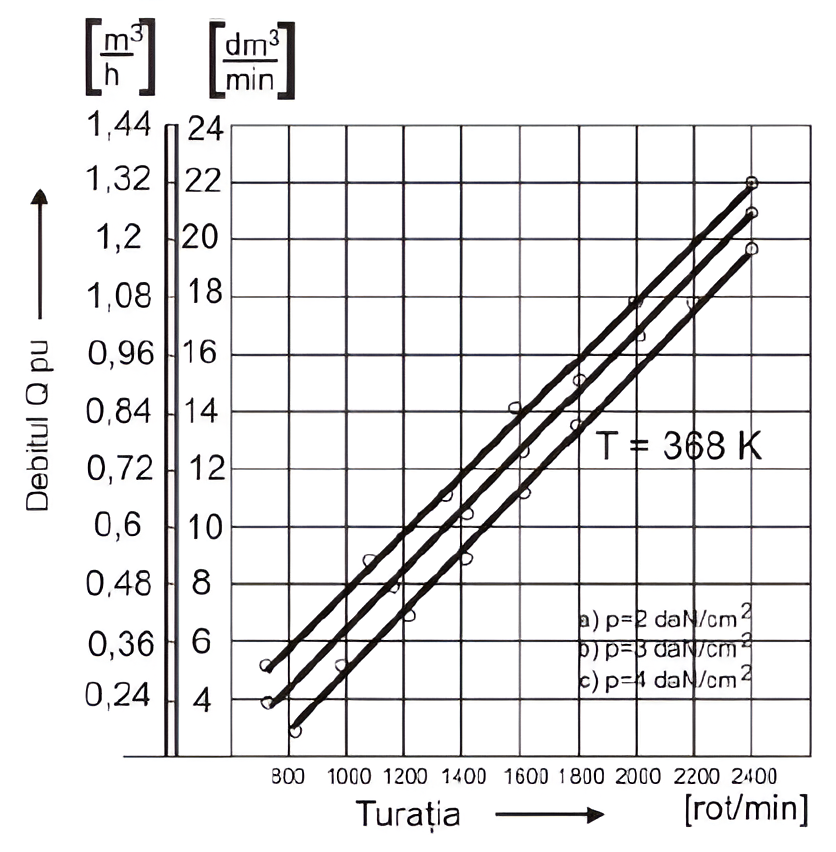 Caracteristica de debit înfuncţie de turaţie este caracteristica de performanţă a pompei, care se determină la temperatura de 368 K (95°C) a uleiului,la diferite presiuni de refulare. Această caracteristică se compară cu diagramele etalon. Starea limită a pompei esteconsiderată atunci când valorile obţinute la măsurarea debitului sunt mai scăzute cu 10% faţă de curbele etalon.