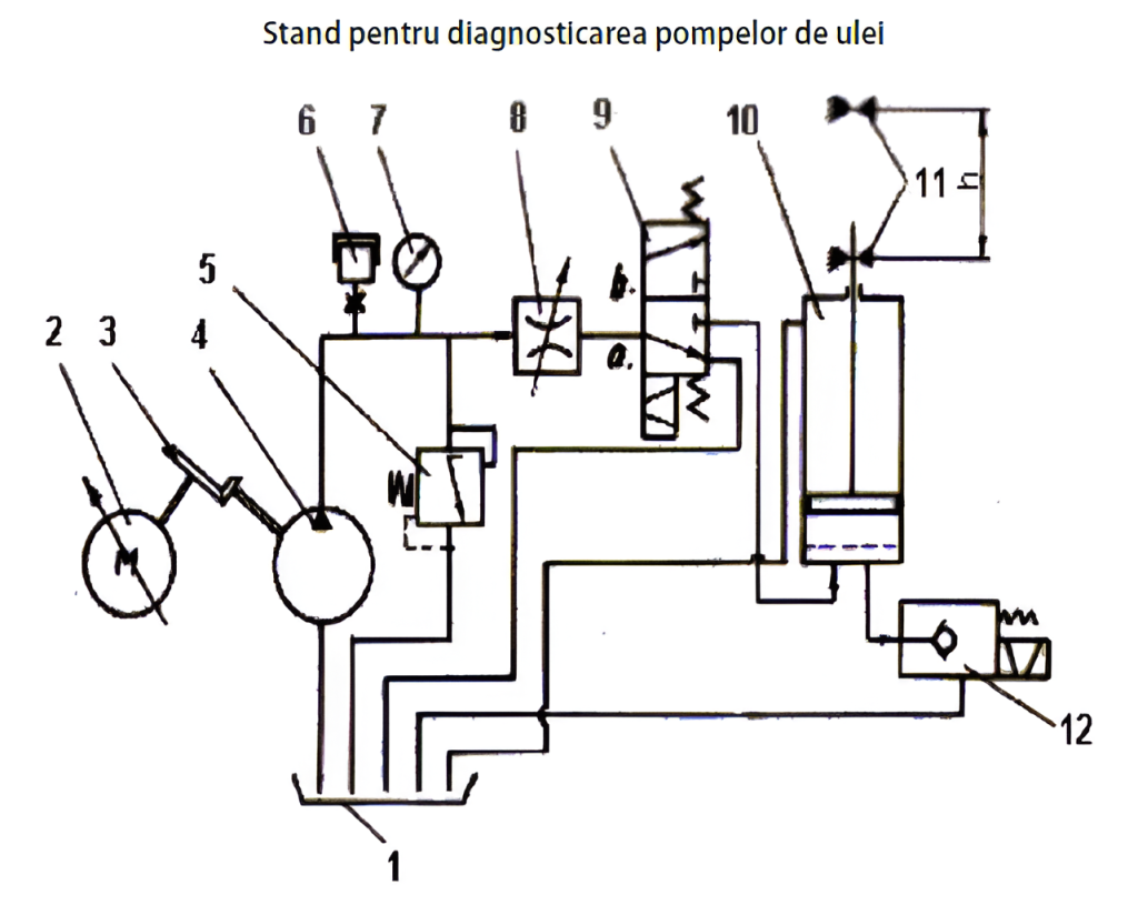 Manometrul 7 măsoară presiunile de refulare ale pompei, conform reglajului efectuat de droselul 8. Circuitul de măsurare este comandat cu distribuitorul hidraulic 9 cu 2 căi (una de retur în rezervorul 1 şi una pentru debitmetru). Măsurarea debitului se realizează cu debitmetrul cu plutitor 10, unde se cronometrează timpul cursei plutitorului între doi senzori de cursă 11. Senzorii sunt conectaţi la un cronometru electronic de la pupitrul de comandă, unde se citeşte, debitul refulat de pompă în funcţie de timpii cronometraţi ai deplasării plutitorului. Supapa electromagnetică 12 serveşte pentru evacuarea rapidă a uleiului din debitmetru.