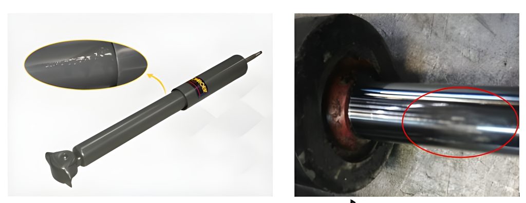 Dacă un amortizor pare să fi pierdut vopseaua de pe o parte a carcasei, acest lucru se datorează cel mai probabil unei alinieri greșite a amortizorului în timpul instalării. Acest lucru se întâmplă adesea atunci când monturile amortizorului sunt strânse în timp ce mașina este ridicată pe un elevator cu 2 coloane, cu roțile atârnând liber și cu amortizoarele complet extinse. Elementul de cauciuc al blocului silențios acționează ca un resort și este proiectat să se deformeze elastic în timpul rotației de 45 de grade în fiecare direcție. Dacă montanții sunt strânși cu suspensia complet întinsă, atunci când mașina este coborâtă la sol, silent block-urile din cauciuc se rotesc complet cu mai mult de 45 de grade. Odată ce șoferul urcă la bord, sarcina suplimentară agravează și mai mult problema, iar amortizorul se blochează complet. Acesta poate chiar să resimtă o forță laterală excesivă, forțându-l să ia o formă parabolică, iar acest lucru va face ca, de obicei, partea din spate a mașinii să fie ridicată în raport cu partea din față. Dacă este depistată rapid, problema poate fi corectată prin desfacerea suporturilor amortizorului cu mașina pe sol și prin resigilarea la valorile de cuplu recomandate. În imaginile de mai jos putem vedea consecințele acestei probleme: marginea scutului de protecție împotriva murdăriei începe să atingă carcasa într-o parte și zgârie vopseaua. Forța laterală aplicată pe tijă de protecție deformează garnitura de ulei, provocând scurgeri. Supraîncălzirea lasă adesea urme mai departe, cum ar fi o decolorare pe o parte a tijei.