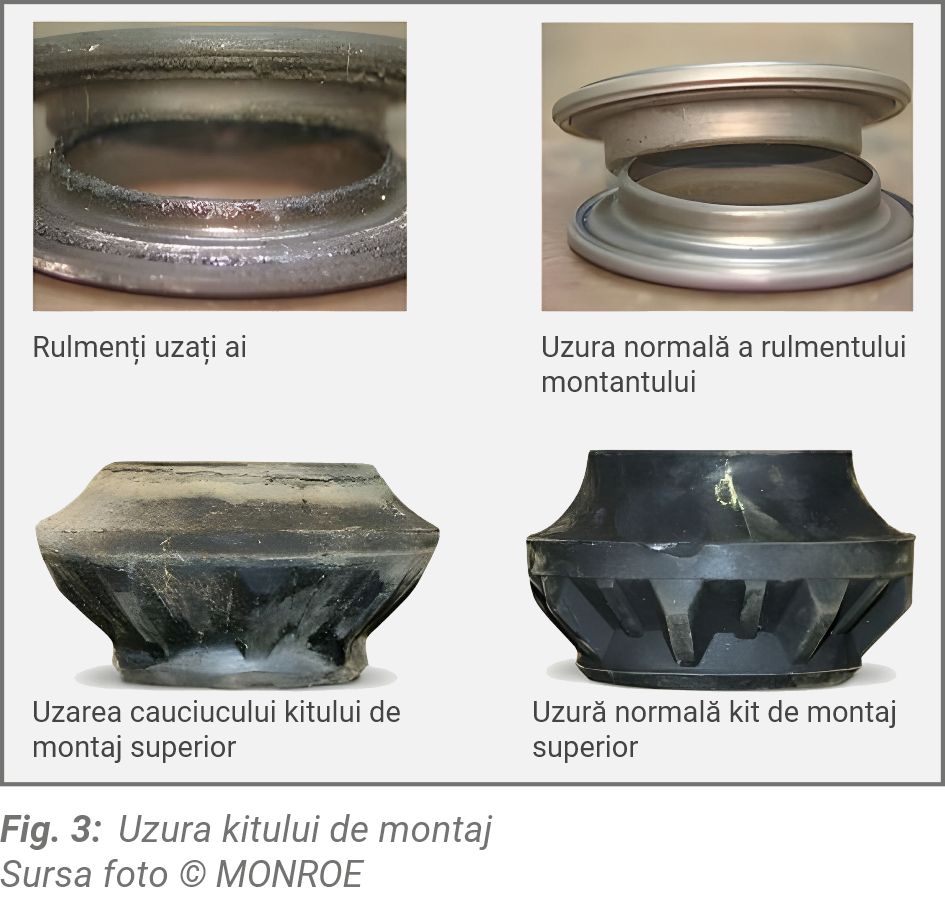 Kiturile de montare superioară sunt supuse unei uzuri severe și sunt alcătuite din două părți fundamentale: un element de cauciuc și un rulment de sprijin care facilitează rotația roților în timpul virajului. În timp, aceste elemente se uzează și trebuie înlocuite pentru a asigura funcționarea corectă a suspensiei și a sistemului de frânare. În cazul în care kiturile de montaj sunt în stare proastă, acest lucru poate provoca un accident grav, în special dacă volanul se blochează atunci când revine în poziția centrală după viraje. Pe măsură ce elementul de cauciuc devine mai dur în timp, în curând pot apărea vibrații și zgomot. Durata lor de viață în condiții normale de conducere este de aproximativ 80.000 km, în concordanță cu cea a amortizoarelor și a montanților. Prin urmare, Monroe recomandă ca, ori de câte ori amortizoarele sau lonjeroanele sunt înlocuite, să se monteze în același timp kituri de montare noi. În gama Monroe, toate Kiturile de montare au numere de piesă care încep cu literele "MK" (Mounting Kit).