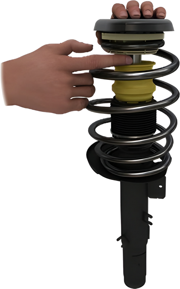 Poziția tamponului din kitul de amortizor este foarte importantă. O greșeală frecventă în timpul instalării este de a trage tamponul în jos, spre partea inferioară a montantului, pentru a avea acces la tijă atunci când se încearcă să se strângă piulița superioară. Cu toate acestea, acest lucru face ca tamponul să împiedice mișcarea corectă a suspensiei și creează o rulare extrem de dură. Instalarea corectă implică pur și simplu mutarea tamponului de compresie (partea galbenă din imaginea de mai jos) în partea de sus a tijei, lăsând un spațiu de aproximativ un deget până la suprafața inferioară a kitului de montare.