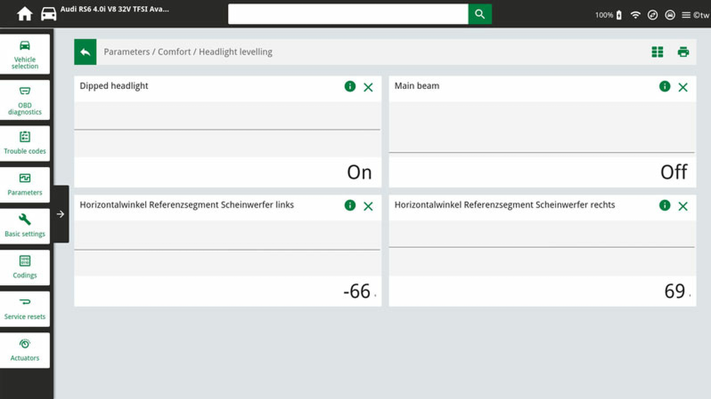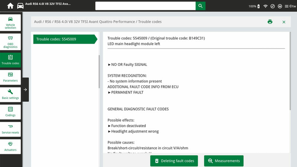 Cu această funcție, codurile de eroare stocate în memoria de erori pot fi citite și șterse. În plus, pot fi apelate informații despre codul de eroare. În exemplul de caz, conexiunea fișei electrice de la far a fost deconectată, ceea ce a dus la stocarea unui cod de eroare în memoria de erori.