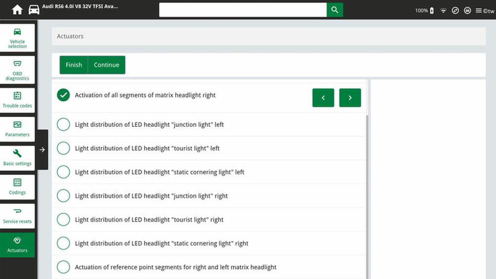 Cu ajutorul acestei funcții, diferitele segmente ale farului Matrix LED pot fi controlate de dispozitivul de diagnosticare. Astfel, se poate efectua o verificare funcțională a periferiei, precum și a componentei de sistem corespunzătoare, fără un efort mare de dezasamblare.