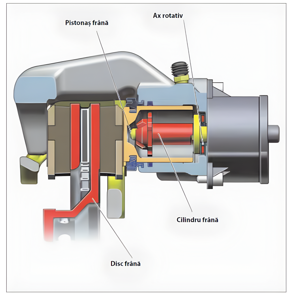 Când frâna de parcare este eliberată, piulița se întoarce pe ax și presiunea este eliminată din pistonul de frână. După o frânare normală, O-ring-ul revine la forma normală și pistonul de frână poate revenii în poziţia iniţială.