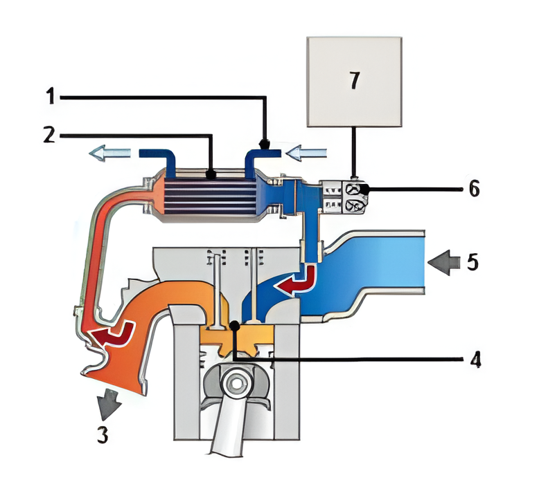 După ce temperatura motorului ajunge la valoarea nominală, pentru a crește eficiența sistemului EGR gazele arse sunt răcite prin intermediul unui radiator. Supapa de by-pass este activată atunci când motorul este rece, gazele arse ocolesc radiatorul de răcire și intră direct în motor.