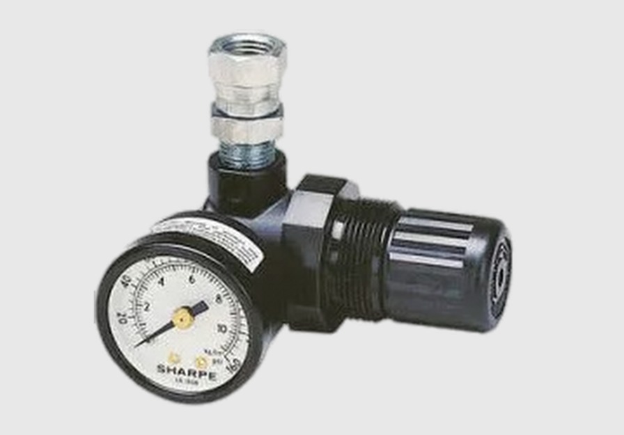 De asemenea, veți avea nevoie de o modalitate de a seta presiunea aerului în locul în care acesta intră în pistol. Există mici regulatoare cu manometre care se atașează la baza pistolului. Acestea arată cam așa: