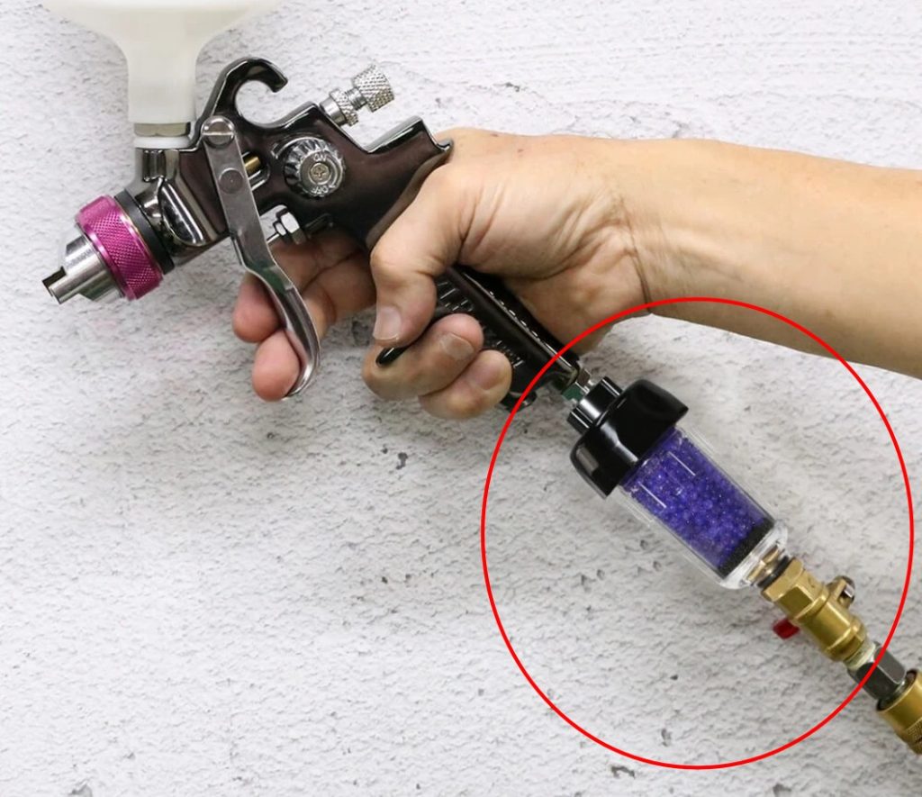 De asemenea, aveți nevoie de un uscător de aer. Dacă aveți orice fel de apă sau ulei în conductele de aer, vă va distruge munca. Aveți nevoie de unul care se montează pe perete, de preferință, și este o idee bună să puneți unul dintre cele mici de unică folosință la capătul pistolului. Acestea arată cam așa: