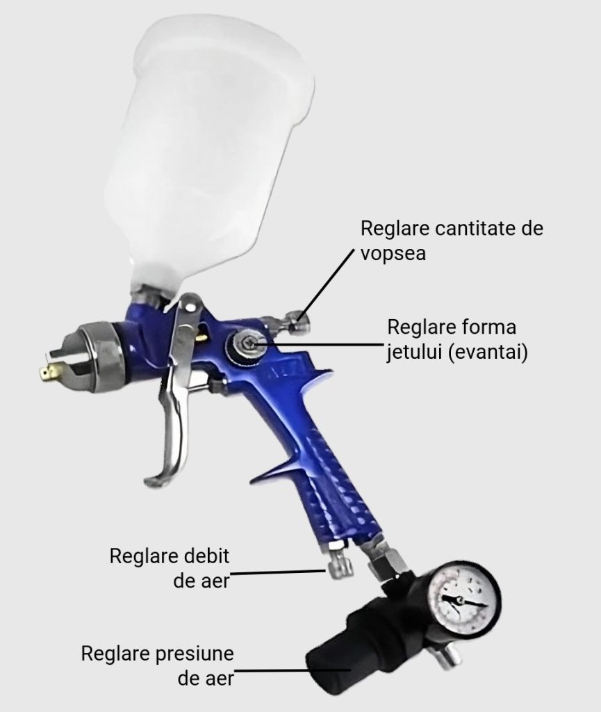 Un pistol HVLP (High Volume, Low Pressure) utilizează un volum mare de aer care trece prin pistol pentru a pulveriza vopseaua, în loc de presiune înaltă. Chiar dacă veți avea undeva în jur de 3,5 bar intrând în pistol, doar aproximativ 0,7 bar vor ieși din pistol la capsa de aer (de unde iese vopseaua). Dar va ieși foarte mult aer la presiune scăzută (volum mare). Sunteți confuz?