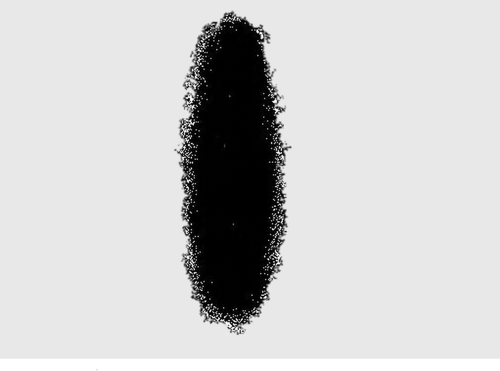 Acum țineți pistolul la o distanță de aproximativ 20 sau 20 cm de hârtie. Aceasta este distanța la care doriți să pulverizați. (Modelul dvs. va fi acum mai lung, deoarece sunteți mai departe de hârtie. Ar trebui să aibă o lungime de 8-10 centimetri). Acum testați din nou. Ar trebui să aveți un model în formă de trabuc, cu o acoperire completă în formă de trabuc în centru, cu o acoperire din ce în ce mai slabă care se îndepărtează de acoperirea completă. Acoperirea decolorată pe care o vedeți îndepărtându-se de centru este cea pe care o veți folosi pentru a vă "seta" pistolul. Ar trebui să arate cam așa: