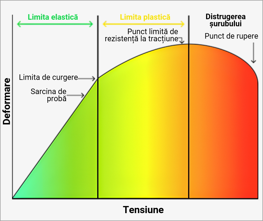 Tensiunea dintr-un dispozitiv de fixare este direct proporțională cu deformația acestuia. Tensiunea-deformație a unui element de fixare va încorpora o limită elastică (elasticitate) și o limită plastică