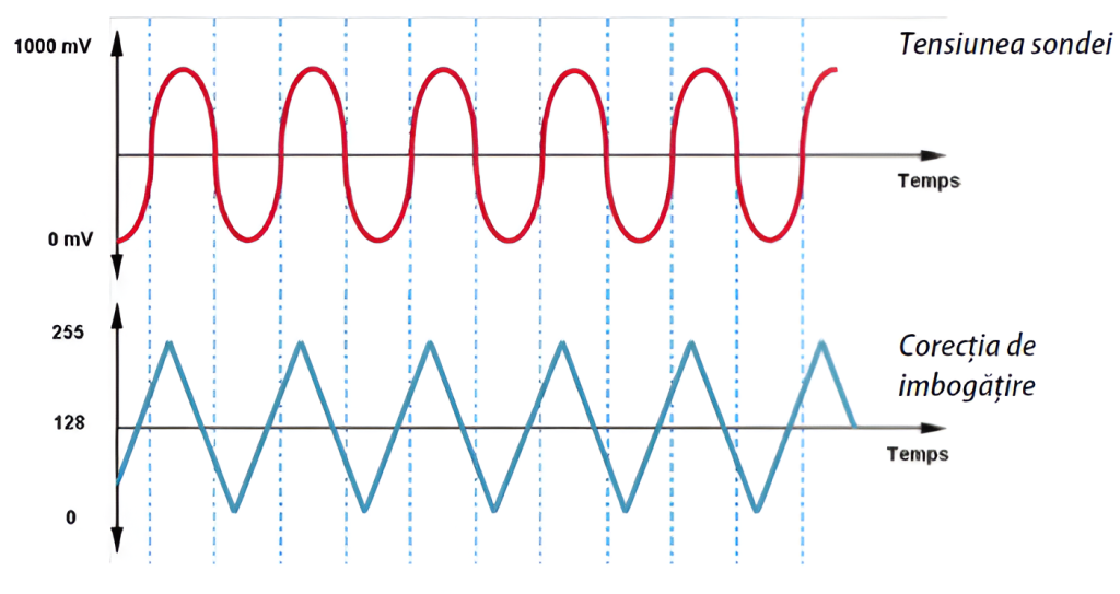 Când valoarea este mai mare de 128, calculatorul comandă o îmbogăţire (prin mărirea timpului de injecţie) deoarece amestecul este sărac (tensiunea sondei mai mică de 500 mV).