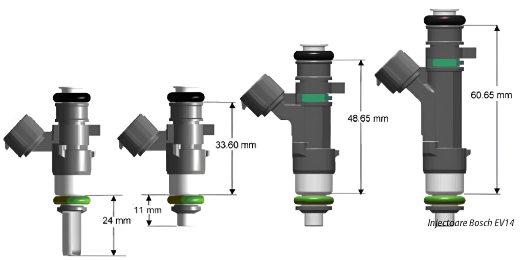 În funcție de geometria și arhitectura galeriei de admisie aer, precum și de cerințele impuse injectoarelor acestea pot avea dimensiuni diferite, la aceleași caracteristici tehnice. Un exemplu în acest sens este injectorul Bosch EV14