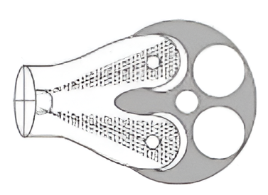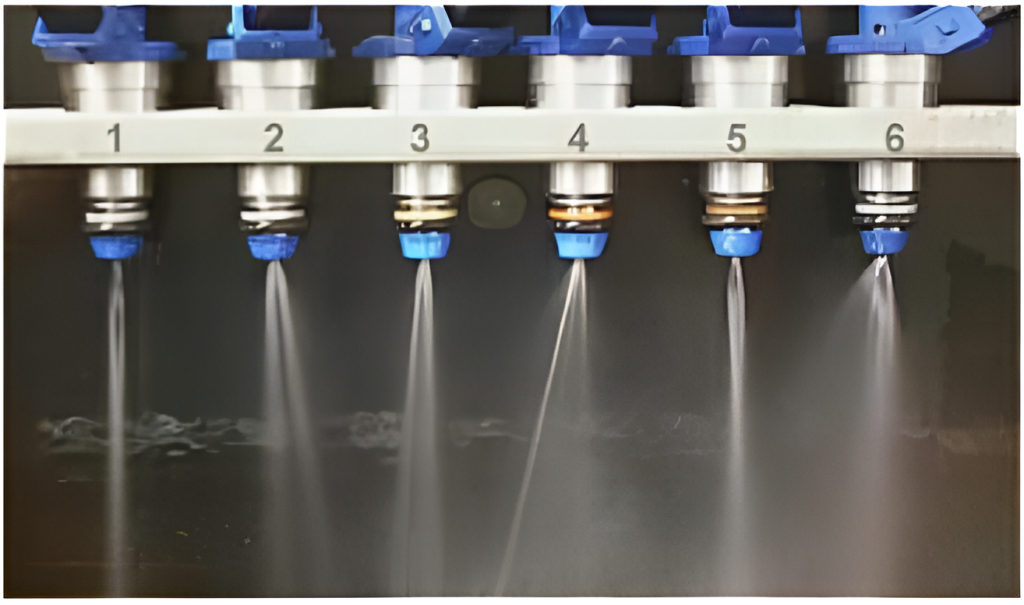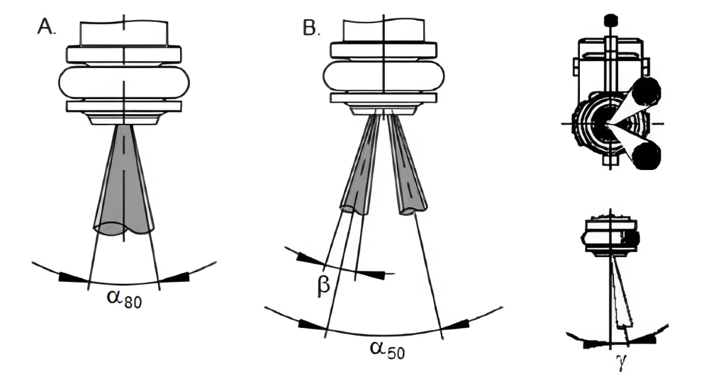 La motoarele cu o singură supapă de admisie jetul este unitar, în formă de con. La motoarele cu două supape de admisie jetul este divizat sub un anumit unghi, în două conuri, fiecare jet direcționat către o supapă de admisie (vezi poza de mai sus).