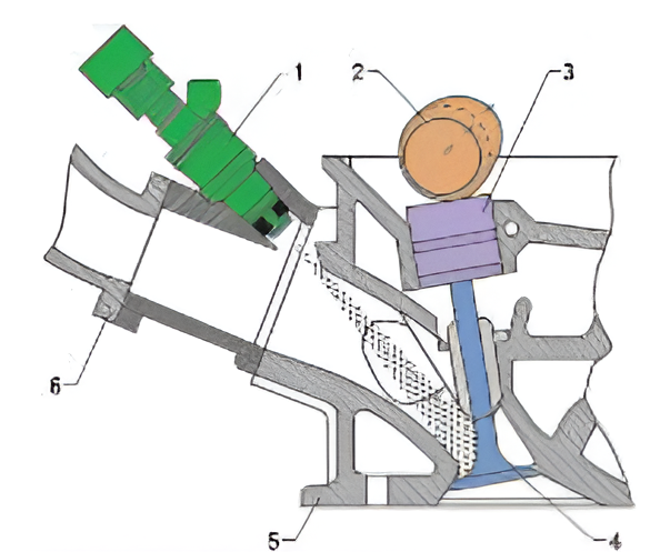 - Injector 2. Arbore cu came 3. Tachet 4. Supapă de admisie 5. Chiulasă 6. Galerie de admisie