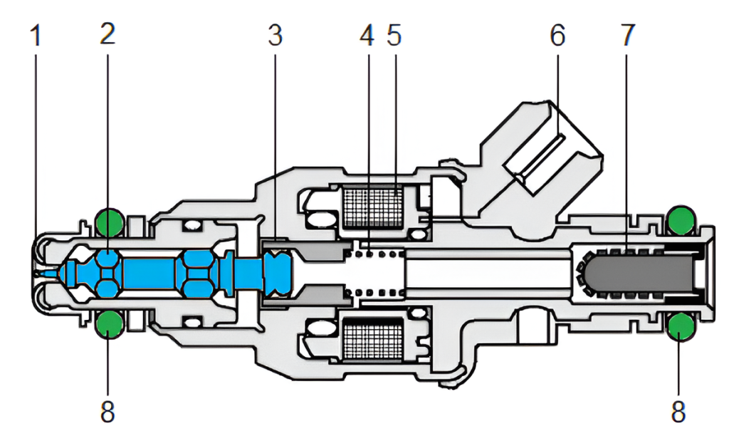Pentru a injecta combustibilul în galeria de admisie, calculatorul de injecție, prin intermediul contactelor electrice (8), alimentează cu energie electrică solenoidul (4). Acesta se energizează și produce o forță magnetică care ridică acul injectorului (6) de pe sediu (7). Pentru a opri injecția de combustibil, calculatorul de injecție întrerupe alimentarea cu energie electrică iar arcul elicoidal (5) apasă acul injectorului (6) pe sediu (7).