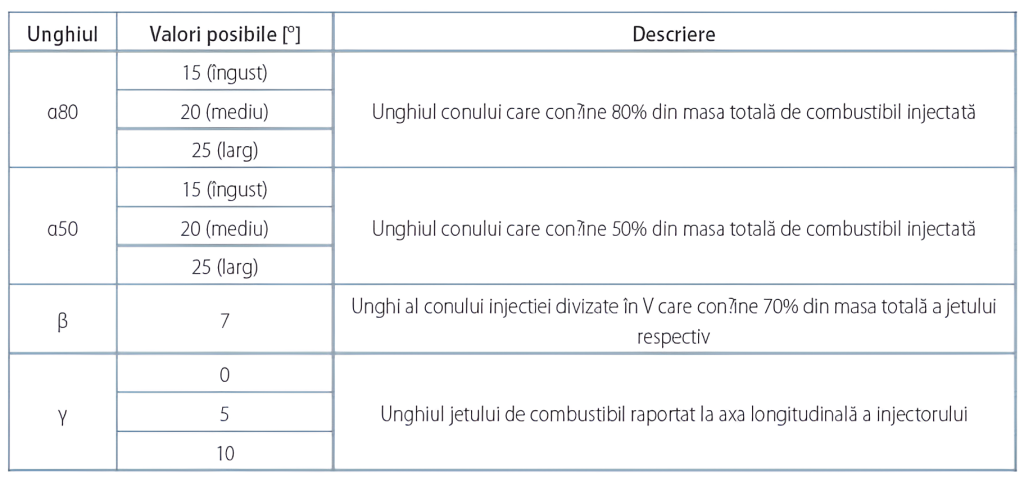 Jetul de combustibil este caracterizat de o serie de parametrii. Acești parametrii depind de forma constructivă a acului injector precum și de sediul supapei. Jetul de combustibil este determinat de o serie de unghiuri cu următoarele specificații: