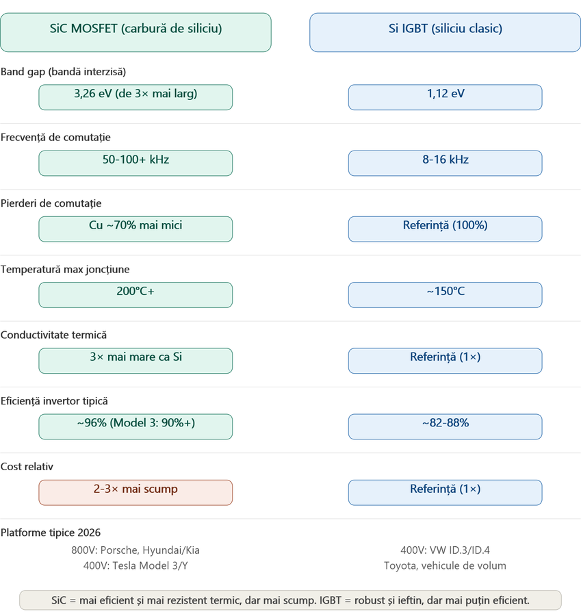 MOSFET-ul din SiC (Silicon Carbide) este „noul venit" — deși cercetarea pe SiC a început în anii '80, prima aplicație masivă în automobile a fost în 2018, când Tesla a instalat 24 de module SiC MOSFET fabricate de STMicroelectronics în invertorul Model 3.