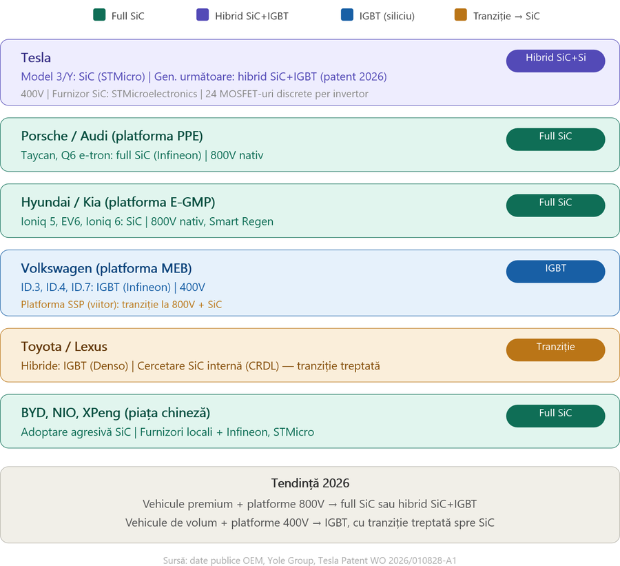 Tendința generală în 2026: vehiculele premium și cele cu platformă de 800V folosesc SiC; vehiculele de volum pe 400V rămân predominant pe IGBT din rațiuni de cost; invertorul hibrid SiC+IGBT (conceptul Tesla) apare ca soluție de compromis.