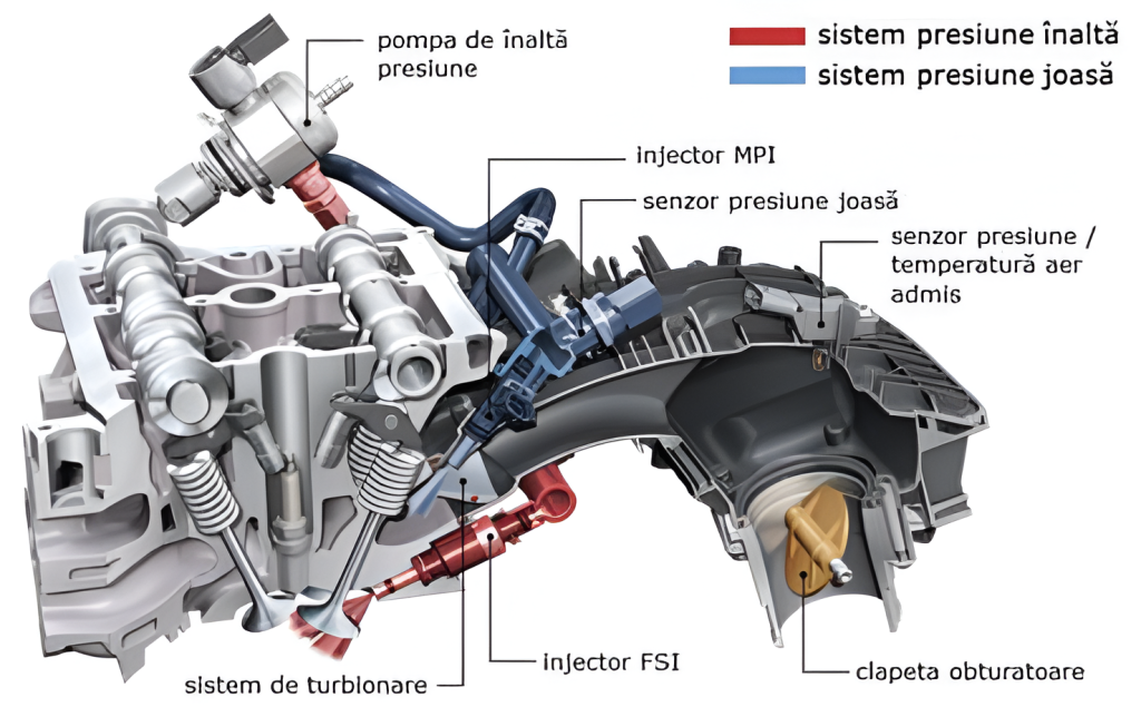 EU6 . În domeniul sarcinii parţiale , motorul este alimentat prin injectoarele MPI pe când injectoarele de înaltă presiune (HDEV) sunt folosite la sarcini mai mari şi la pornire.