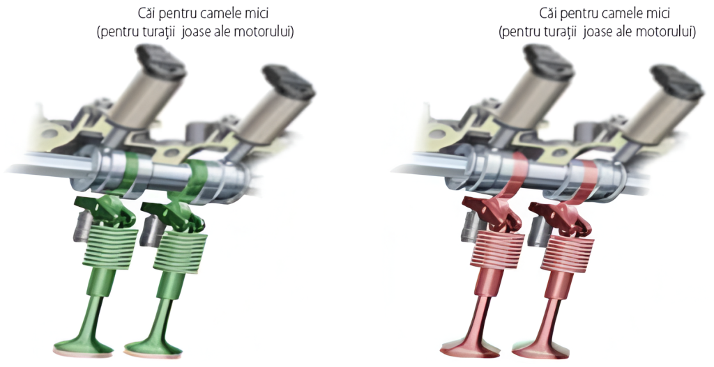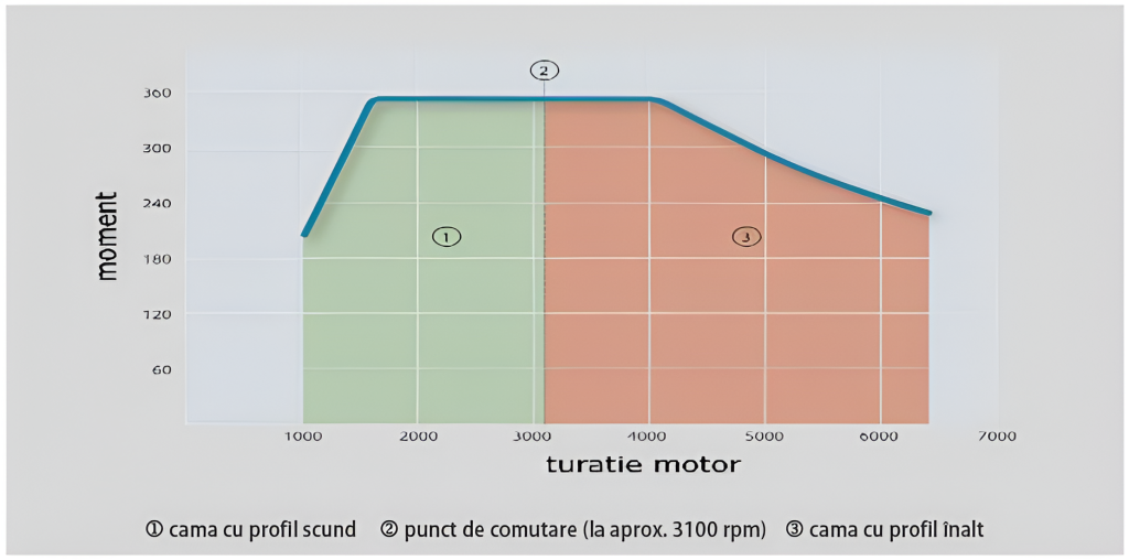 La turaţii joase ale motorului, este folosită o camă cu contur al proeminenţei mai mic. La turaţii mari ale motorului, sistemul schimbă la o camă cu contur al proeminenţei mai mare.