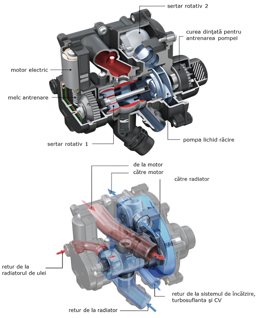 Unitatea de acţionare centrală a sistemului de management al temperaturii este modulul sertarului rotativ fabricat din plastic care permite două rotaţii ale sertarelor rotative la fluxul de control al lichidului de răcire. Motorul electric al sertarului rotativ 1 acţionează şurubul cumelc . Sertarul rotativ 1 este apoi conectat cu sertarul rotativ 2 cu sistem de angrenare. Sertarul rotativ 1 substituie un termostat convenţional şi , în funcţie de cerinţe, el poate controla ca temperatura lichidului de răcire să varieze foarte rapid între 85°C şi 107°C. Pe partea de sus a lui , sertarul rotativ 1 controlează fluxul de retur al lichidului de răcire de la răcitorul de ulei al motorului.