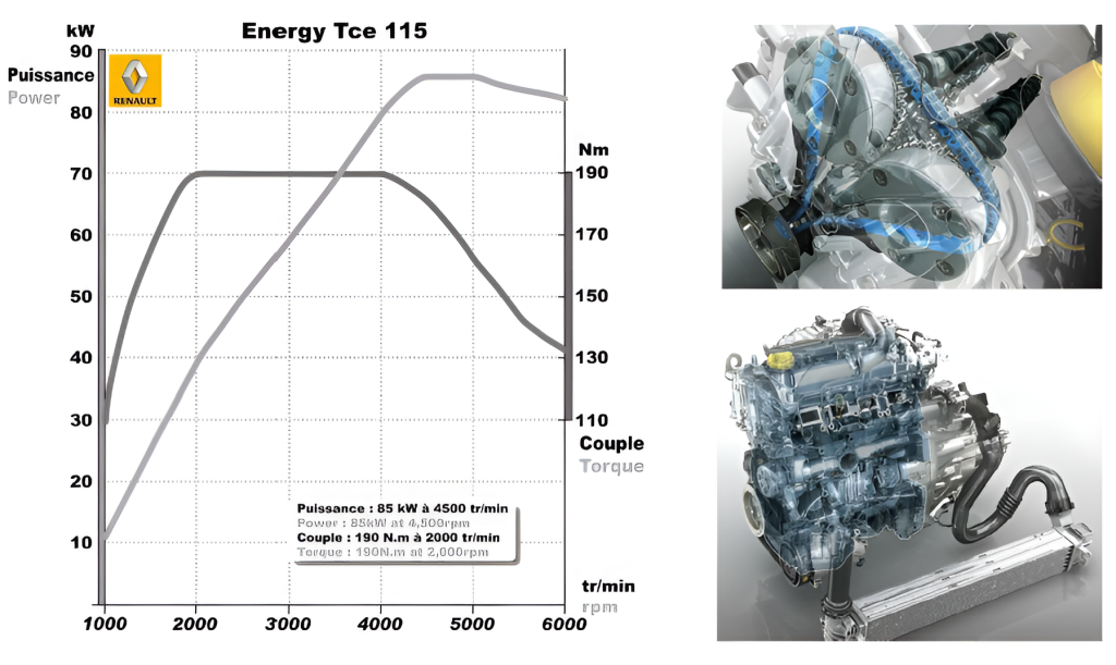 Combinarea acestor tehnologii pe motorul 1.2 TCe 115 CP a condus la obținerea unor performanțe remarcabile (aprox. 100 CP/litru) combinat cu scăderea consumului de combustibil și a emisiilor. Cu acest motor Renault se înscrie în gama producătorilor care și-au evoluat propulsoarele clasice pe benzină cu sisteme de injecție directă și supraalimentare cu turbocompresor.