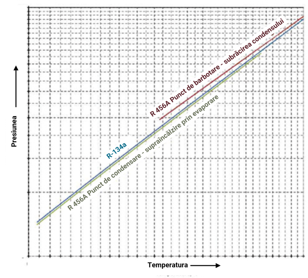 Graficul presiune-temperatură arată cât de apropiate sunt valorile R-134a și curbele R-456A, ceea ce înlătură orice preocupare legată de piesele de calibrare a sistemului.