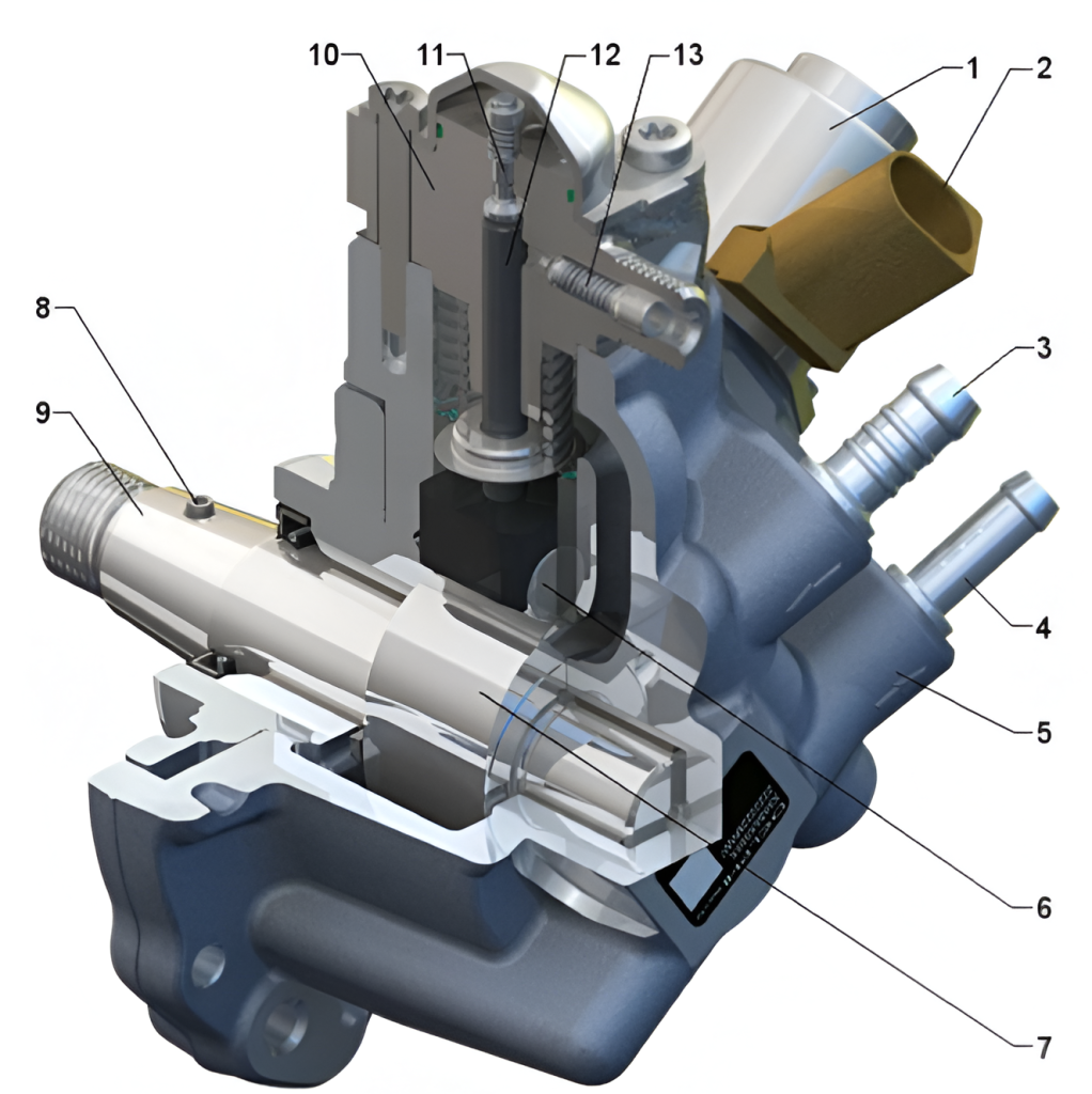 Supapa de control a debitului (1) este utilizată pentru a regla debitul combustibilului care intră în camera de compresie (piston).
