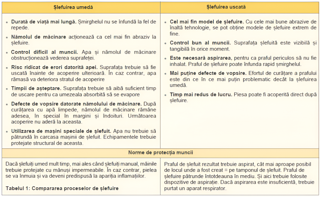 Decizia de șlefuire umedă sau uscată depinde practic de suprafață. Toate suporturile absorbante trebuie șlefuite uscate.