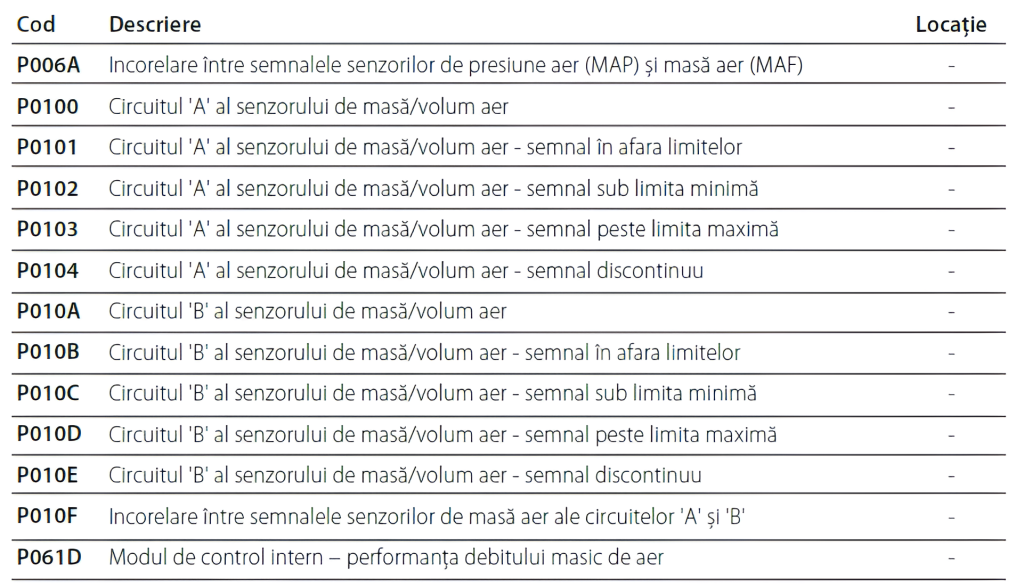 CODURILE DE EROARE OBD ALE SENZORULUI DE MASĂ AER ADMISIE