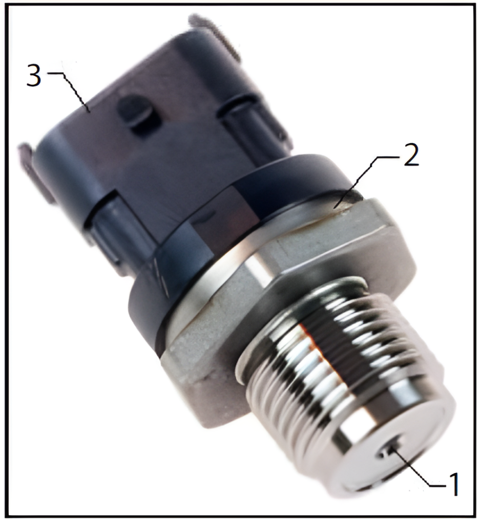 Elementul sensibil al senzorului conține mai multe pelicule semiconductoare pe bază de siliciu, conectate în punte Wheatstone. Această arhitectură permite și compensarea efectelor temperaturii asupra senzorului. Senzorul de presiune rampă combustibil este un senzor activ. Acesta trebuie alimentat de la o sursă de tensiune, de obicei de +5V. Conectorul electric conține 3 pini: masă, tensiunea de alimentare (UA) și tensiunea de ieșire (UV).