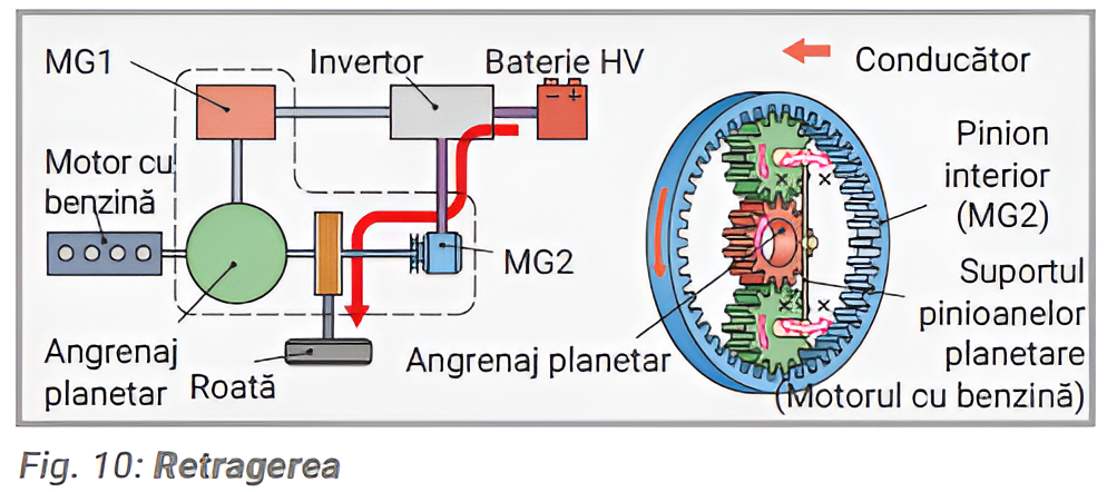 Retragerea (Fig. 10). Propulsia este oferită exclusiv de MG2 atunci când vehiculul se retrage. Motorul rămâne oprit și MG1 se rotește în direcția opusă fără a genera energie electrică.