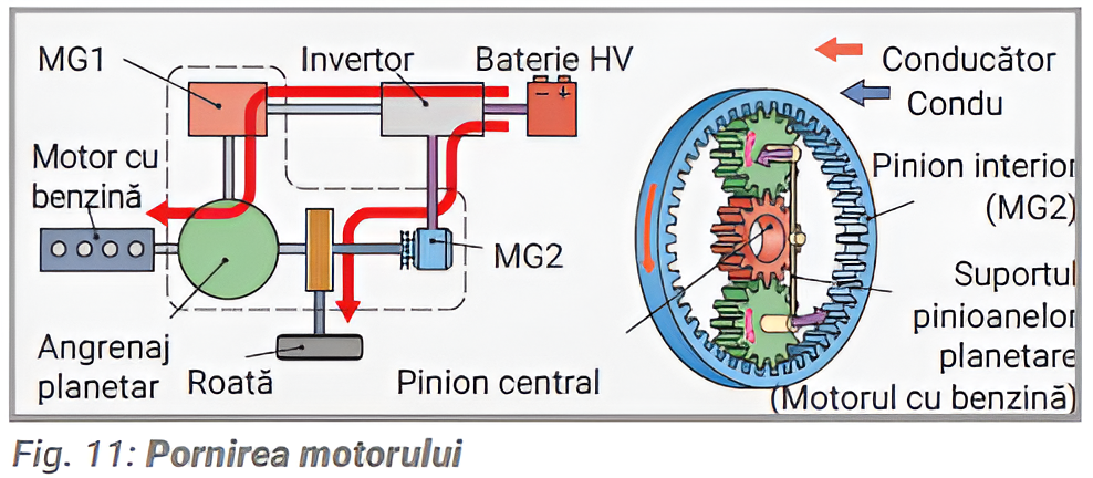 Accelerare (Fig. 11). Dacă este necesar un cuplu mai mare pentru condus, MG1 pornește motorul cu ardere internă ca sistem auxiliar de antrenare. Motorul este pornit, de asemenea, atunci când sistemul de gestionare a acumulatorului detectează o stare de încărcare redusă a bateriei sau temperatura bateriei se abate de la nivelul prescris.