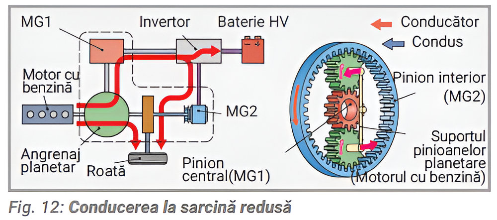 Conducerea la sarcină redusă (Fig. 12). Transmisia planetară împarte forța motrice a motorului. O parte din această forță este aplicată roților motoare, iar restul este utilizată pentru a genera energie electrică cu ajutorul MG1. MG2 poate oferi sistemului de acționare un suport suplimentar.