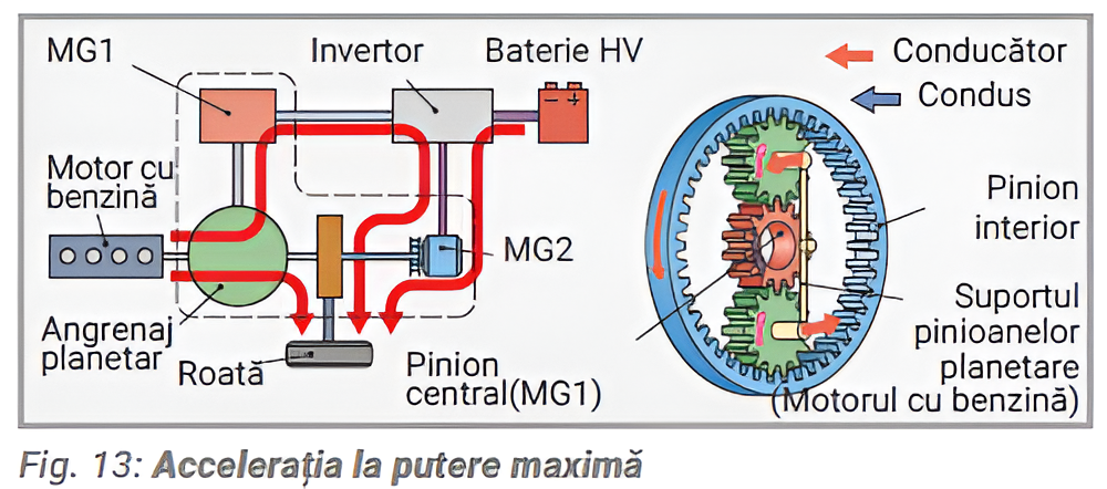 Accelerația la putere maximă (Fig. 13). Atunci când vehiculul necesită o putere de propulsie ridicată, sistemul crește forța de la MG2 prin extragerea energiei electrice suplimentare din bateria HV (High Voltage - tensiune înaltă)