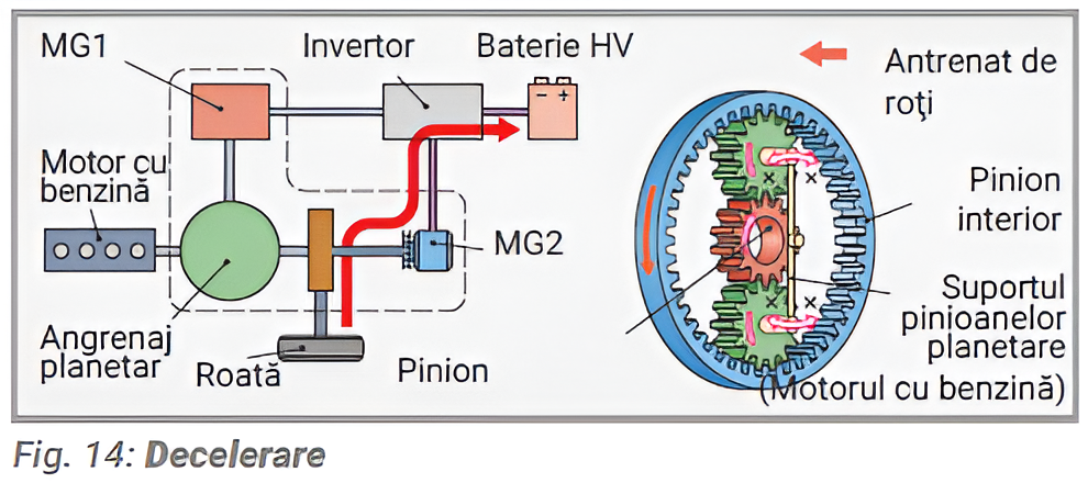 Decelerare (Fig. 14). Motorul este oprit când vehiculul este frânat sau este în modul de depășire a turaţiei limită. Roțile motoare acționează acum pe MG2, care funcționează ca un generator și încarcă bateria HV.